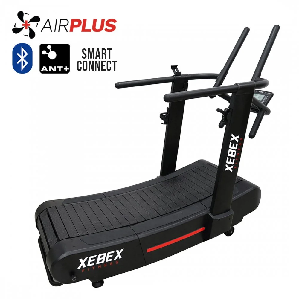 The Xebex AirPlus Runner Smart Connect is a non-motorized, self-generated, curved treadmill. It uses no electricity and instead runs on the energy produced by the runner’s own movement on the treadmill. Beginners and competitors can run at desired speed and change output at will with no maximum or minimum speed setting. Further, the AirPlus lever allows users to adjust the resistance from level 1 up to level 8 for added resistance. Use our multi-grip handlebar to mimic sled drives in various handle grip options.